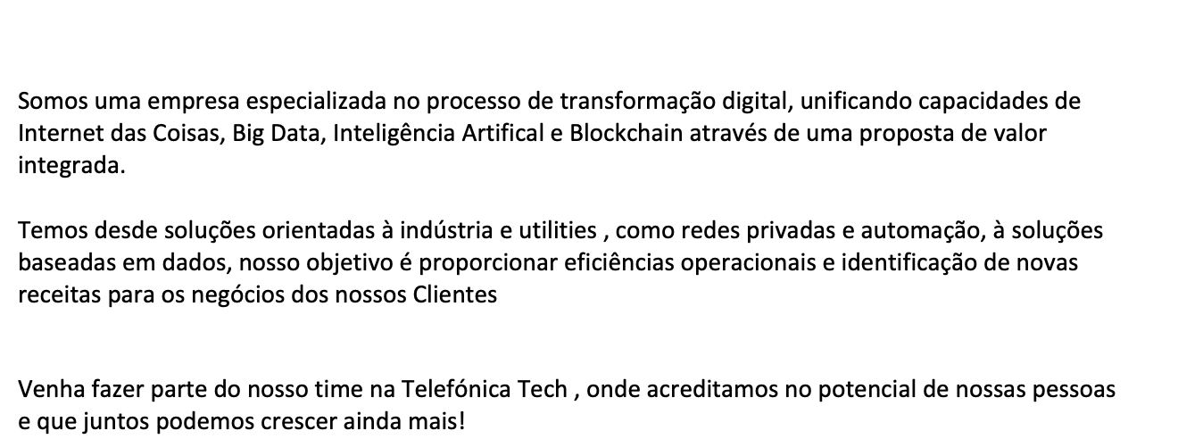 Somos a Telefónica Tech, provedora global de serviços de Cloud, IoT e Big Data do grupo Telefônica, que agora, além de líder de telecomunicações, lidera também o mercado de Tecnologia. Trabalhamos com o propósito de Digitalizar para Aproximar pessoas, negócios e toda a sociedade, construindo uma nação mais conectada e transformando a vida dos brasileiros. Buscamos ampliar a autonomia, a personalização e as escolhas em tempo real dos nossos clientes, colocando-os no comando da sua vida digital, com segurança e confiabilidade, tudo isso com a qualidade que só o grupo Telefônica tem.