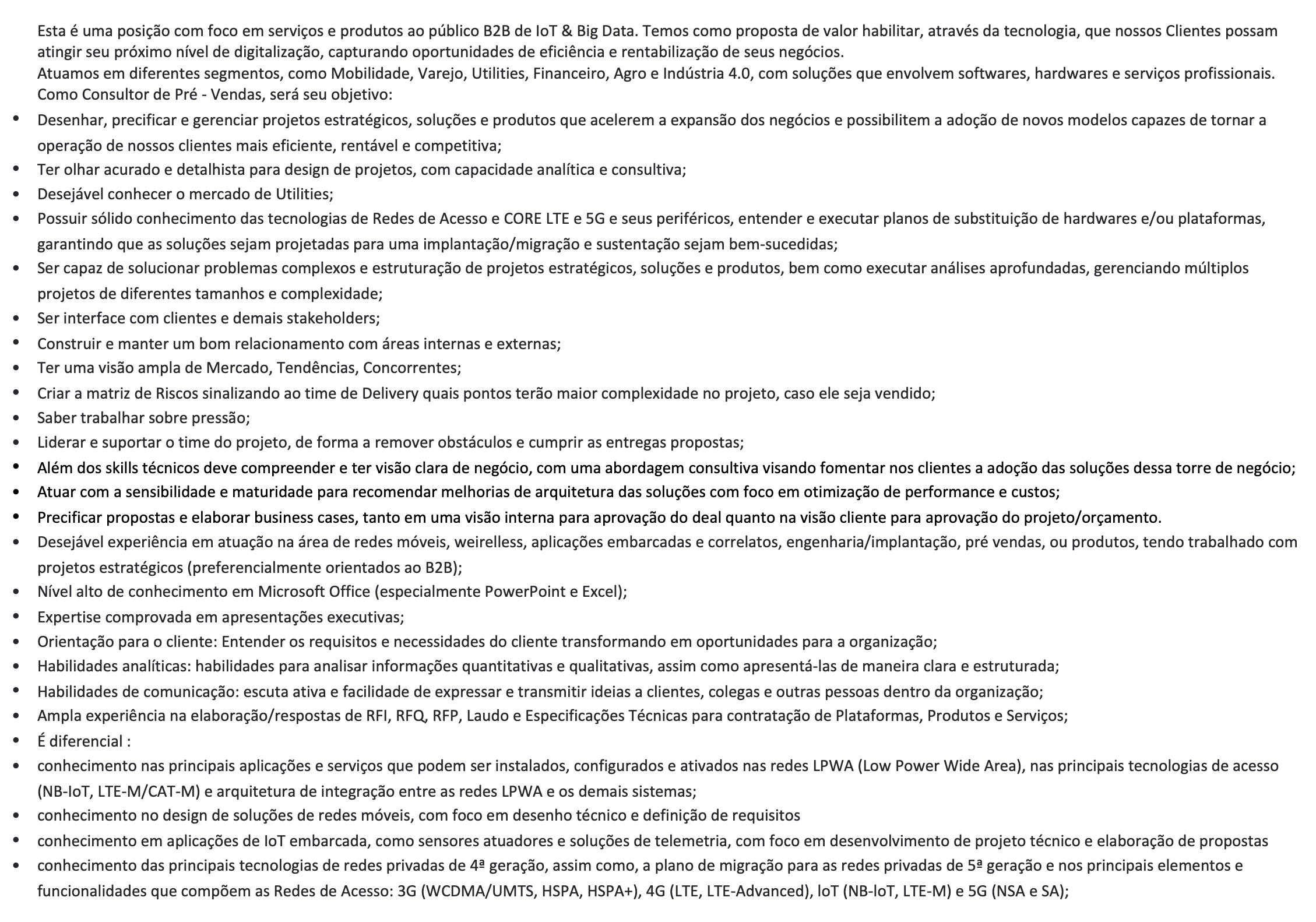 Na Vivo não medimos esforços em apoiar e valorizar nossos colaboradores. Não são apenas excelentes benefícios, mas também flexíveis. · Escolher o benefício ideal para você e seus dependentes, numa plataforma digital com diversas categorias de Academia, VR, VA, Auxílio Farmácia, Assistência Médica, Odontológica e Seguro de Vida; · Celular corporativo. Sim, um smartphone novinho para você! · Plano de voz e Dados ilimitado! Sim ilimitado! Com a melhor rede móvel, ainda mais rápida com o 5G da Vivo! · Uma oferta exclusiva da Vivo, com desconto especial em linha fixa, banda larga, TV e apps; · Terá direito a receber Bônus ou PPR anual; · Planejará seu futuro através do plano de Previdência Privada; · Tem filhos? Terá direito a um subsídio para ajudar nas despesas com escola, creche ou babá; · Viver em um ambiente que respeitará sua personalidade, seu estilo de se vestir, seu jeito de ser e poderá ser autêntico. #VemdeVocê · Trabalhar remotamente até 3 vezes por semana. #Mobility · Ter flexibilidade de horário; · Aproveitar um dia de folga (Day off) para comemorar seu aniversário; · Participar de um dos maiores programas de voluntariado corporativo para você transformar o mundo; · Usufruir do nosso Programa de Desenvolvimento Educacional que oferece parcerias em instituições de ensino com desconto; certificações e cursos online. · Potencializar sua carreira por meio do nosso Programa de Recrutamento Interno, no Brasil ou fora, afinal estamos presentes em mais de 17 países! #VivoMinhaCarreira · Contar com uma série de iniciativas para melhorar a sua saúde física, emocional e social! Por aqui, temos o #VivoBemEstar, que estimula o nosso time a ter hábitos saudáveis e mais qualidade de vida! Disponibilizados aos nossos colaboradores consultas com nutricionista, psicólogos, serviço social, telemedicina, e muito mais! Todas as nossas vagas são elegíveis a pessoas com deficiência e/ou reabilitados. Temos uma cultura que valoriza a diversidade, as diferenças e o potencial das pessoas! #VivoDiversidade #VemPraVivo